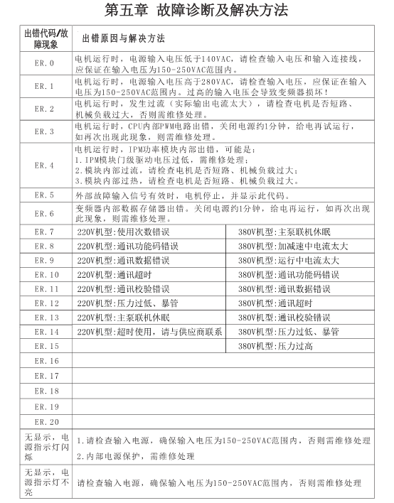 ER.0 :電機(jī)運(yùn)行時(shí),電源輸入電壓低于140VAC,請(qǐng)檢查輸入電壓和輸入連接線應(yīng)保證在輸入電壓為150-250VAC范圍內(nèi)。